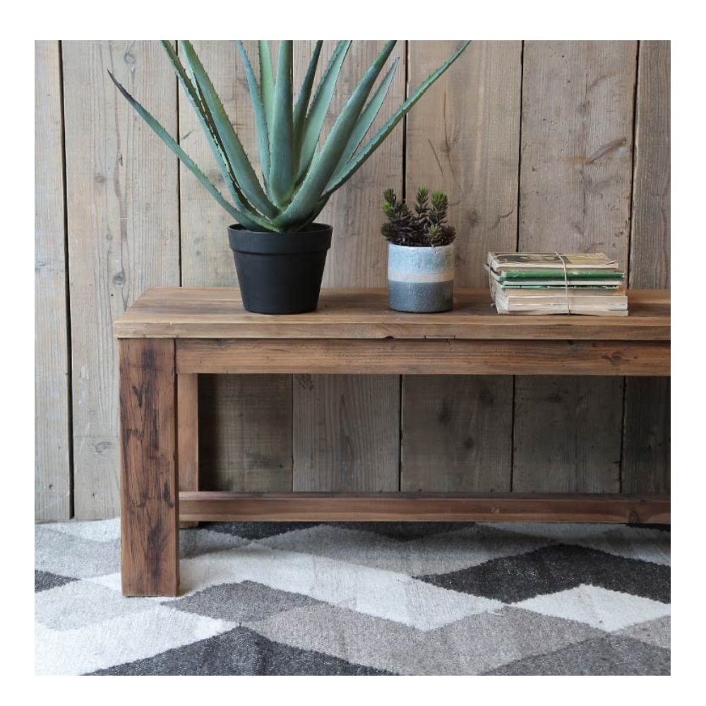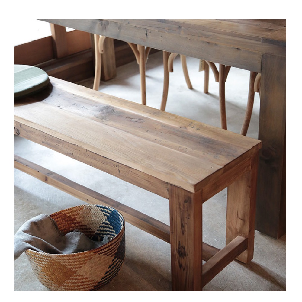 【デコ ベンチ 1250】古材の重厚感と雰囲気を存分に楽しめるシンプルなベンチです。古材の独特の風合いを残すために、色ムラや釘跡、傷等を味わいとして残しています。ベンチとしての活用はもちろん、植物やオブジェを飾ってディスプレイ棚としてもお使いいただけます。