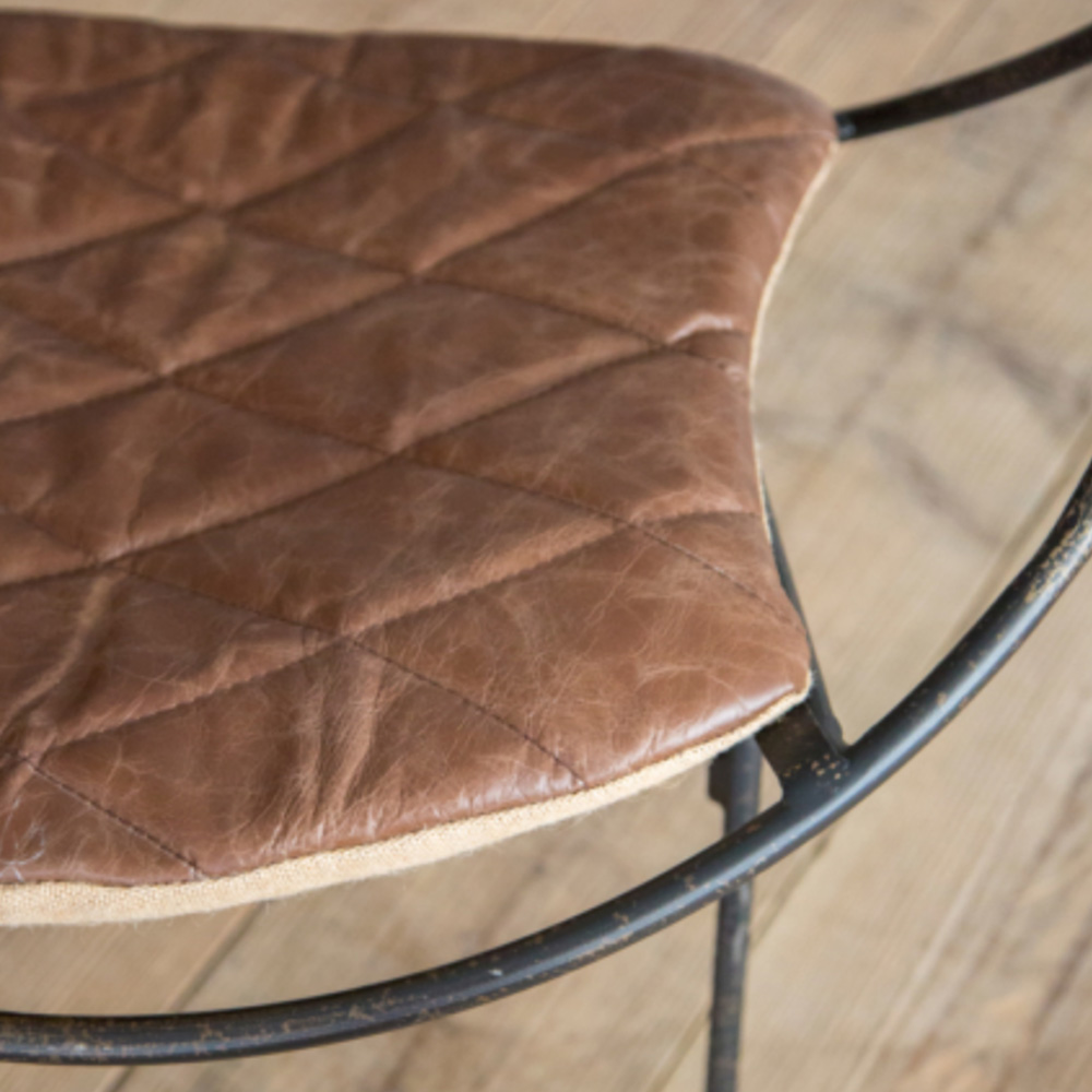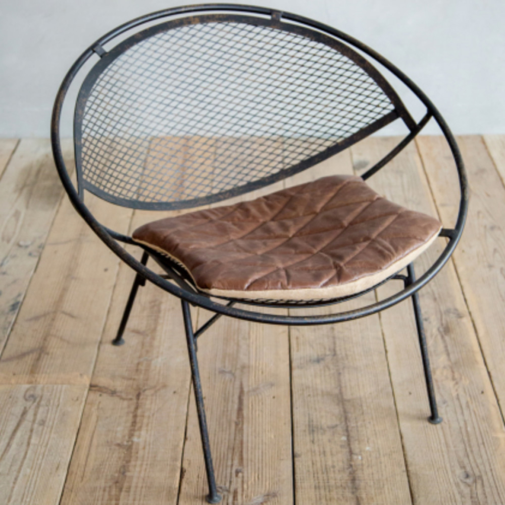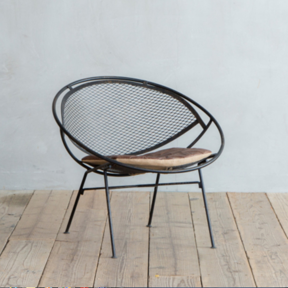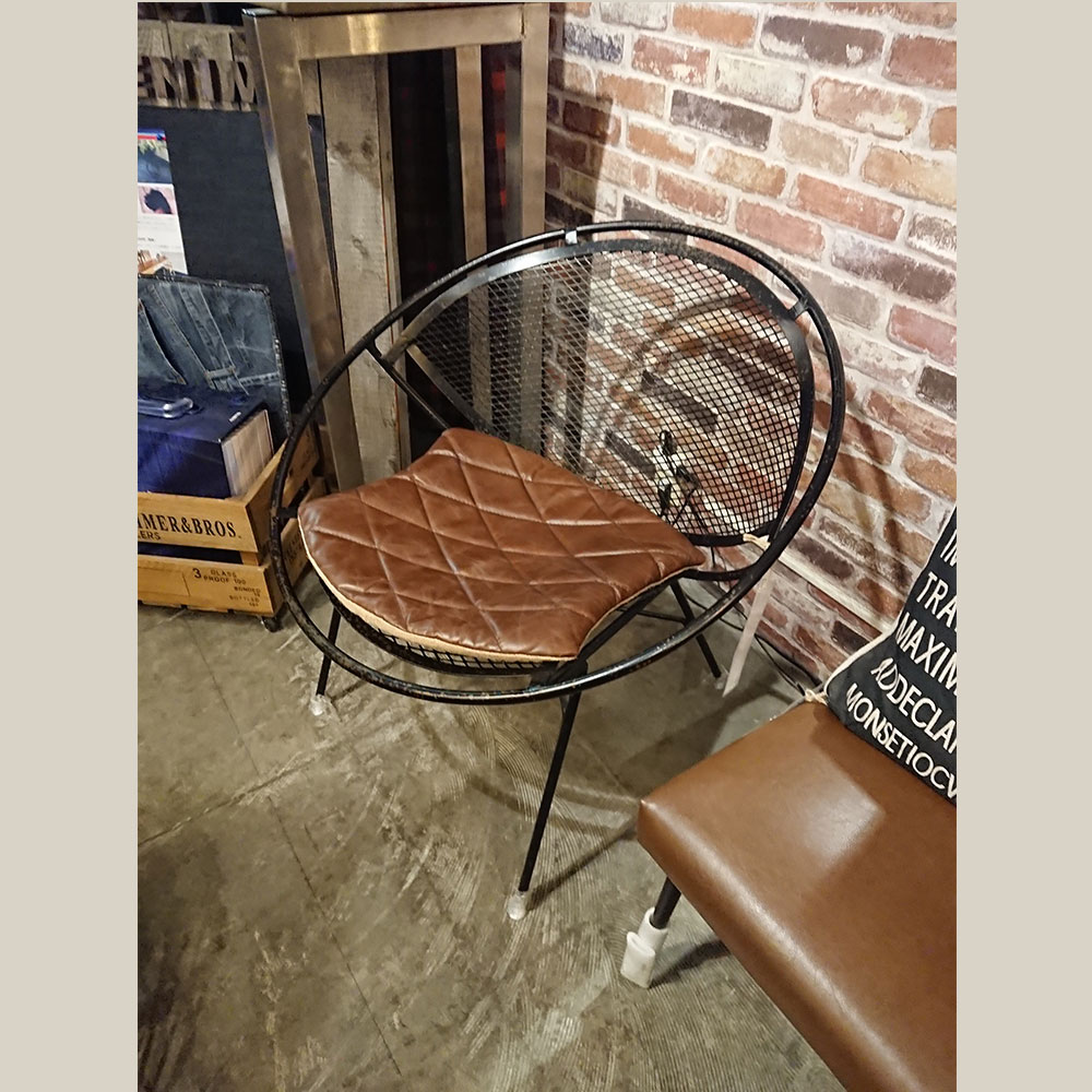 【パーソンラウンジチェア】 パラボラアンテナを思わせる宇宙的なイメージの丸いフォルムでアンティーク風塗装を施したスチールが特徴のチェア。編み目模様の背もたれに合わせたステッチが入ったレザークッションが一体感を感じさせるknot antiquesの逸品です。