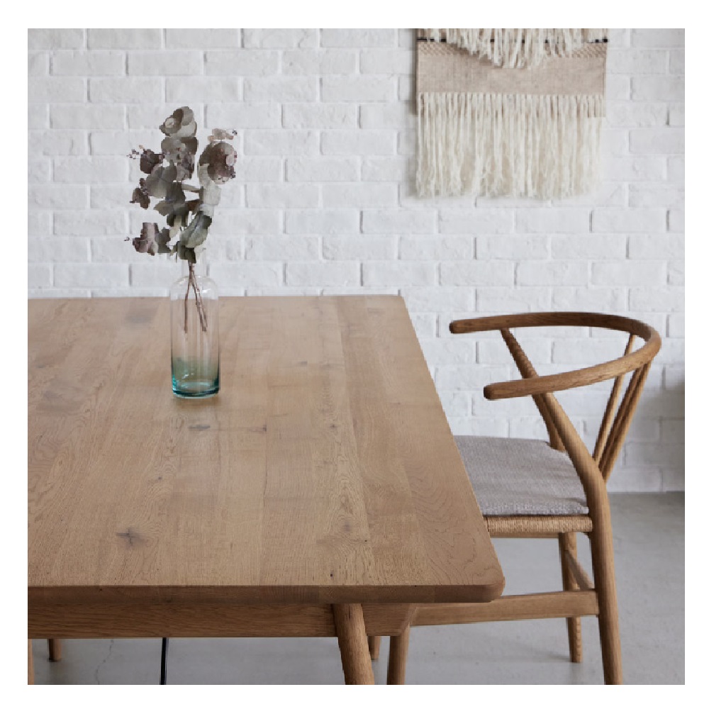 【オクタダイニングテーブル】オイルで仕上げた温かみのあるオーク材と、スチールパーツを組み合わせた クラフト感のあるテーブルです。面取りにこだわった、緩やかな曲線が柔らか い印象を与えます。