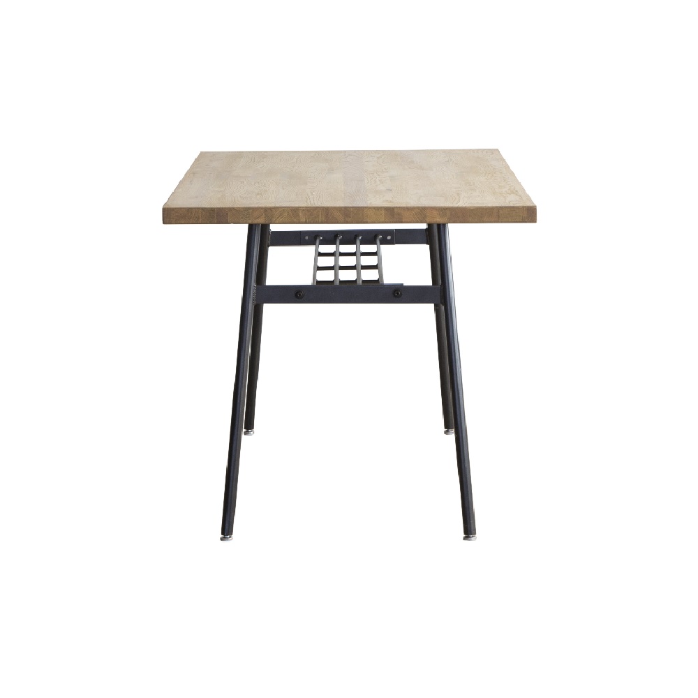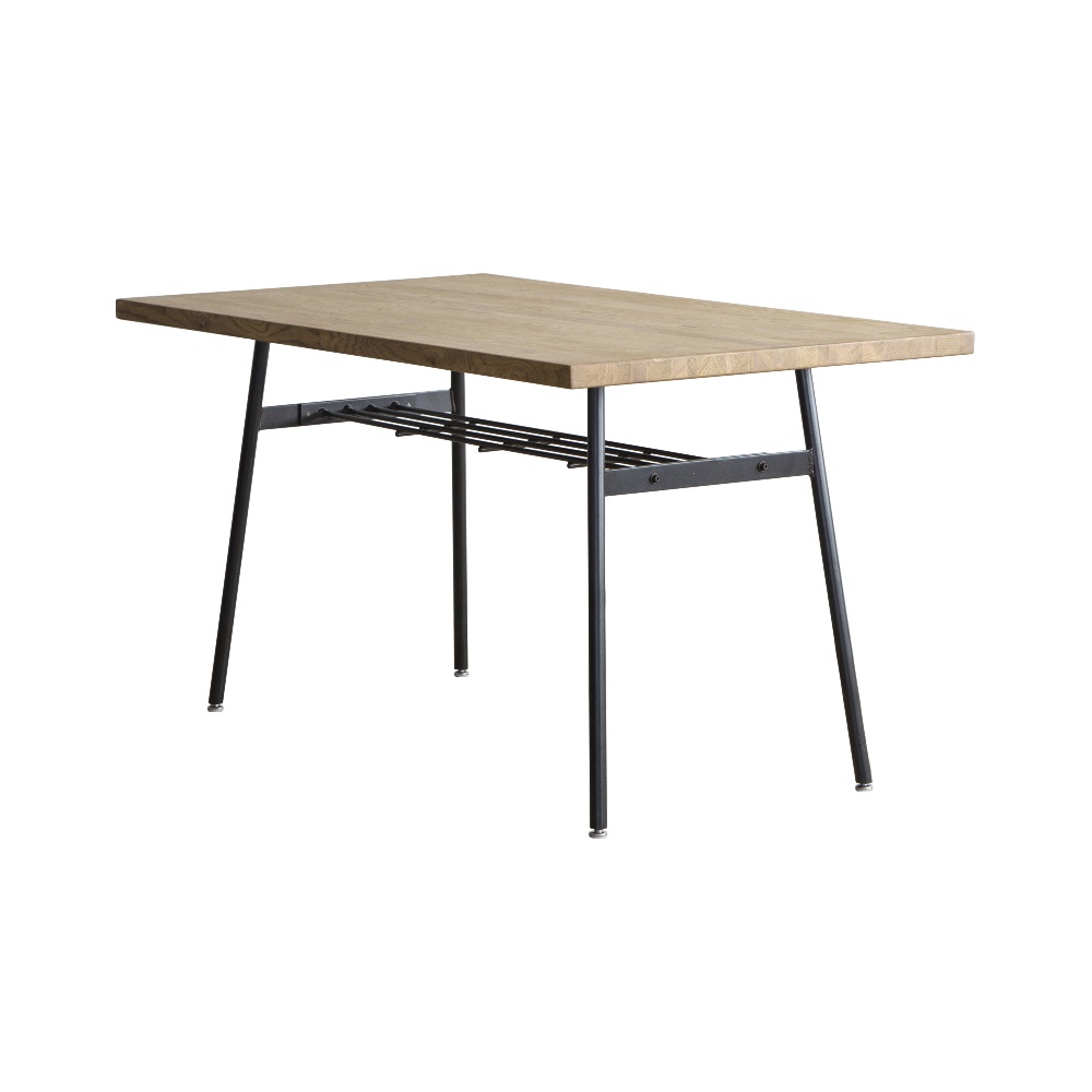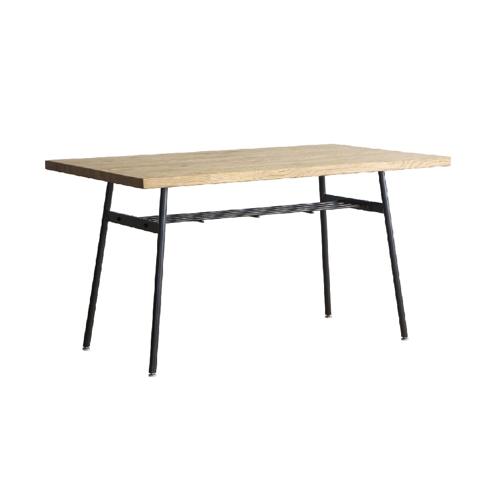 【クッパテーブル オーク材 幅135cm】ラック付きのスチール脚と木天板を組み合わせたシンプルなテーブルです。オイルで自然な風合いに仕上げたオーク材の天板と、縁に無垢材を巻いた趣きのある古材の天板の2種類をシリーズで展開しています。