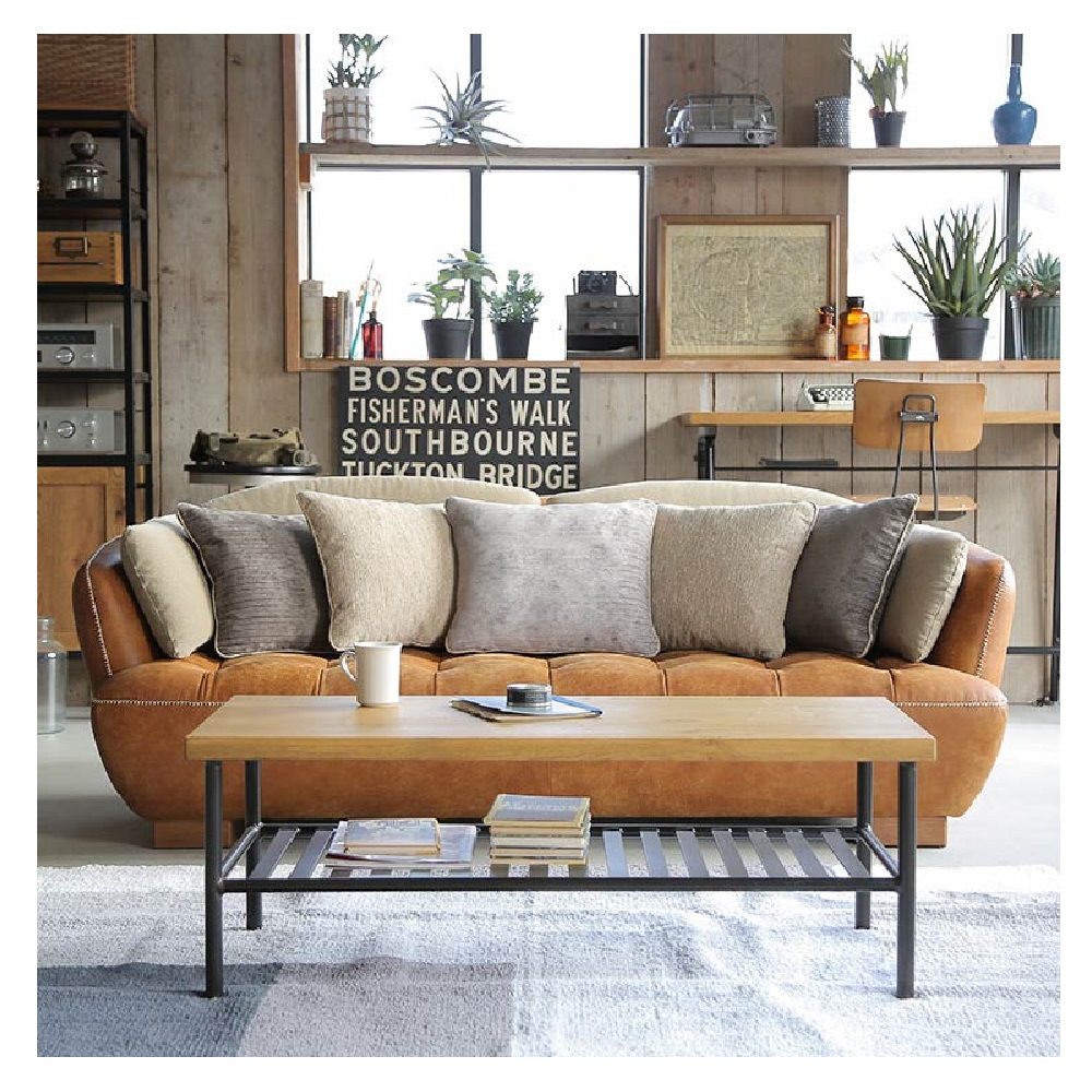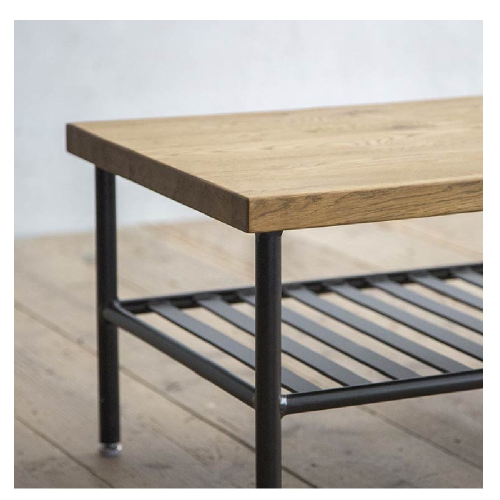 【ギネスリビングテーブル 1100】 2段式のシンプルなコーヒーテーブルで、パイン古材とオーク材2種類の天板をお選びいただけます。スチールの棚板がついており、ソファーに座った時に使うちょっとしたものを置くなど日常的に使いやすいデザインです。