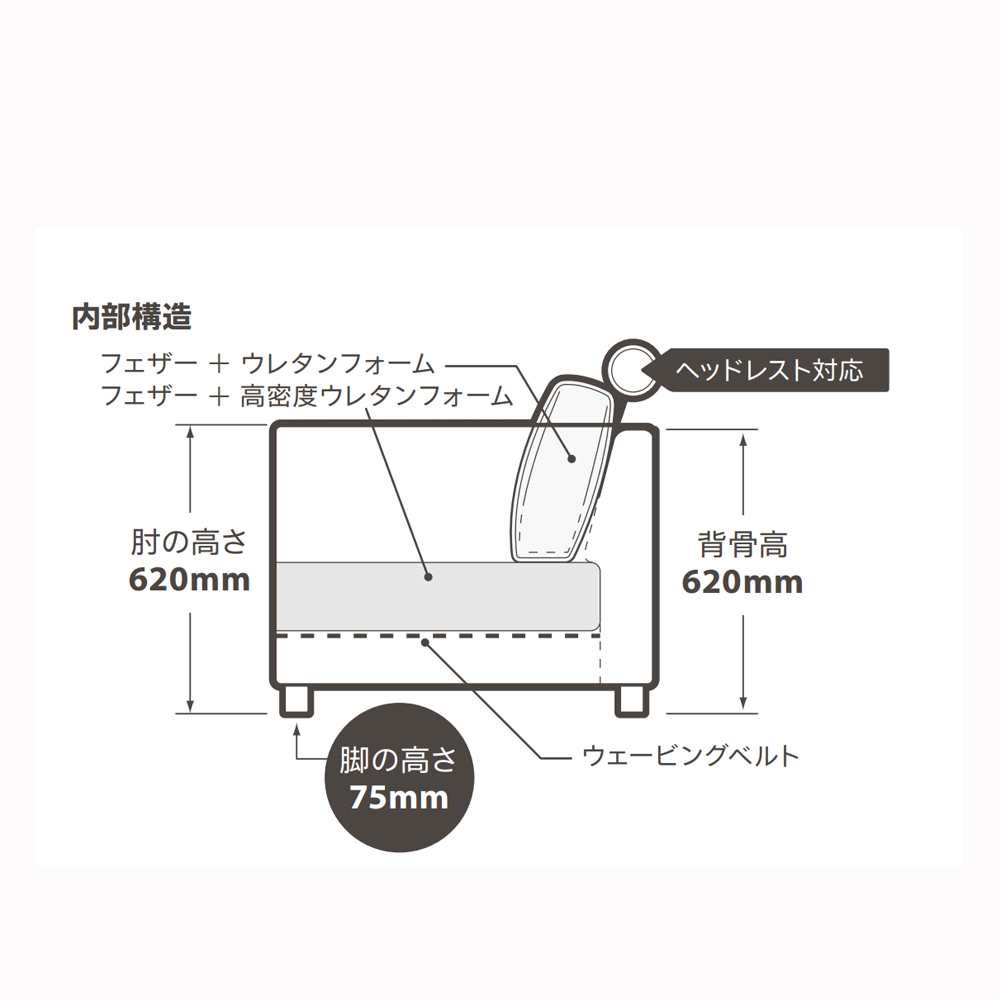 外部:ファブリック(フルカバーリング)/:タモ材(WN色) 内部:フェザー+高密度ウレタンフォーム(座面)/フェザー+ウレタンフォーム/ウェービングベルト