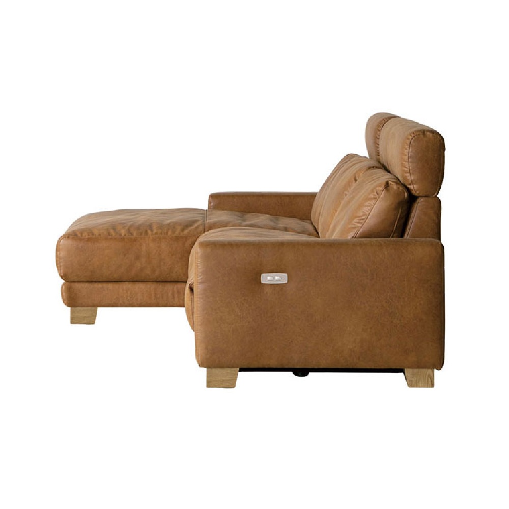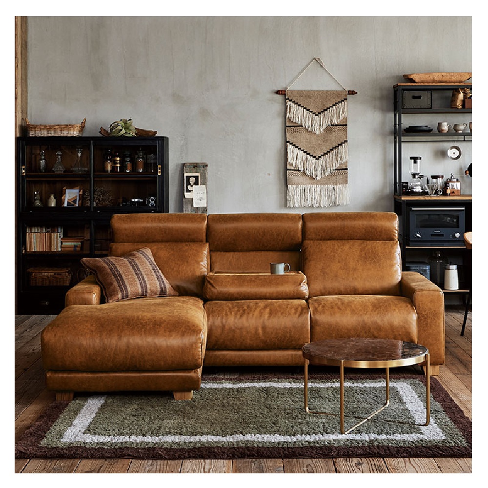 【ハーデス 電動リクライニングソファ カウチ】 肘横のスイッチで座姿勢の切り替えができる電動リクライナーソファ。心地よく沈み込むフェザー入りクッションに全身をあずける、極上のリラックス感が味わえます。リクライナー特有の重厚すぎる存在感を払拭するスマートデザインで、スタイリッシュなコーディネートが叶います。