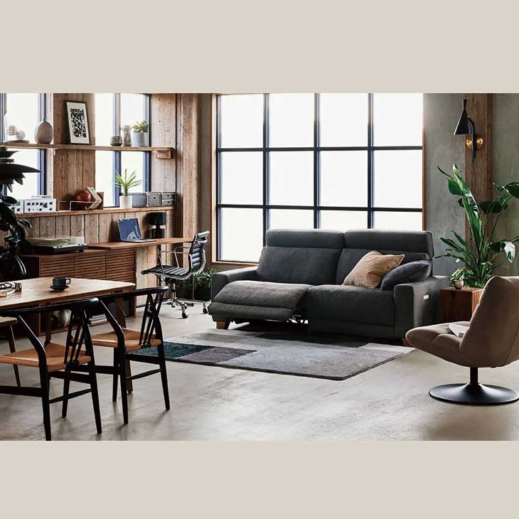 【ハーデス 電動リクライニングソファ 3P 2割】 肘横のスイッチで座姿勢の切り替えができる電動リクライナーソファ。心地よく沈み込むフェザー入りクッションに全身をあずける、極上のリラックス感が味わえます。リクライナー特有の重厚すぎる存在感を払拭するスマートデザインで、スタイリッシュなコーディネートが叶います。