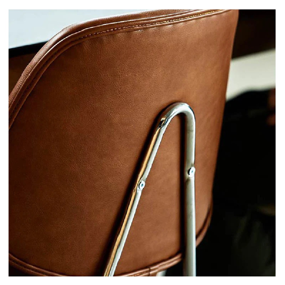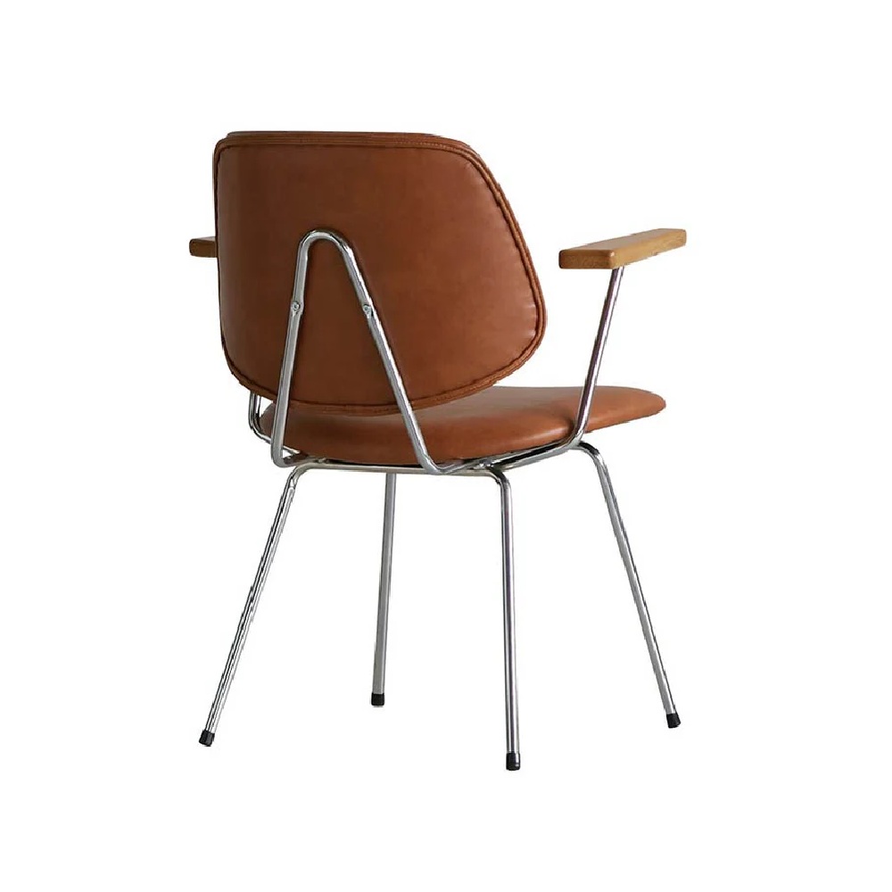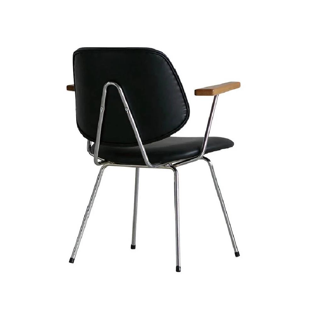 【アボックチェア 肘付 クロム脚】 ミッドセンチュリーデザインをベースにしたチェア。当時をイメージしたレトロさとモダンな雰囲気を取り入れました。エッジの効いた脚と木製の肘置き、背のパイピングなど細部のディティールもこだわっています。背と座のシートが優しくしっかりとホールドしてくれる座り心地です。