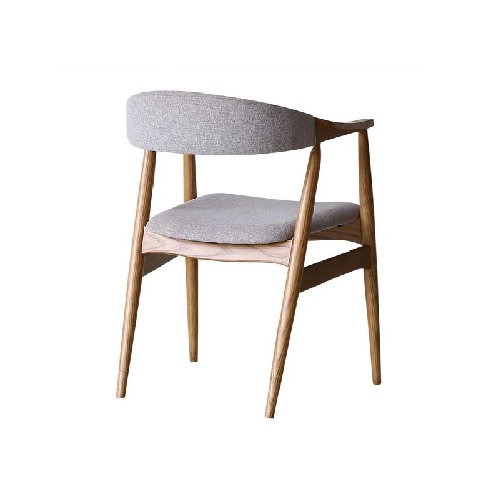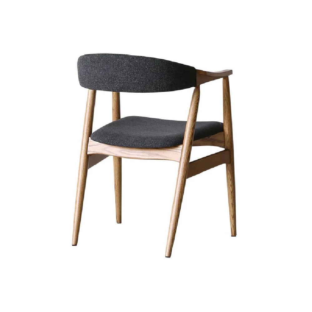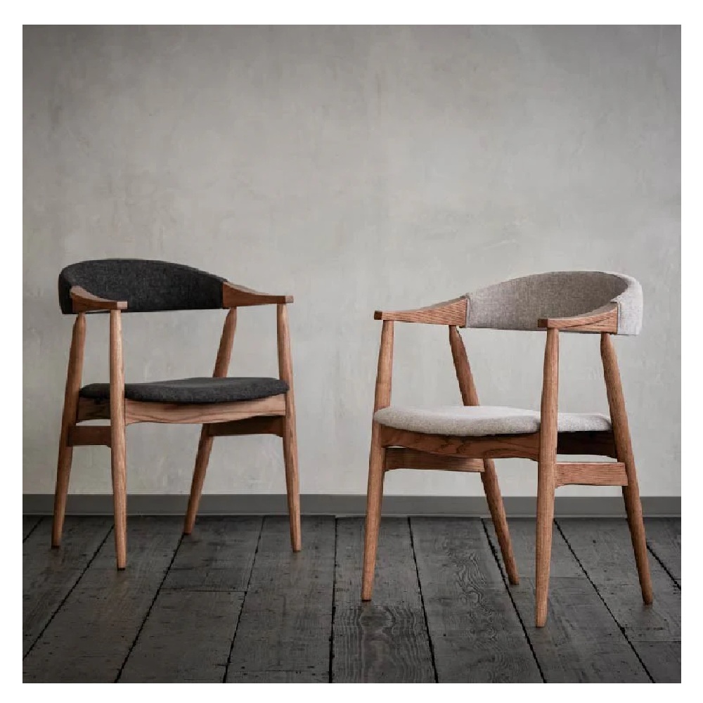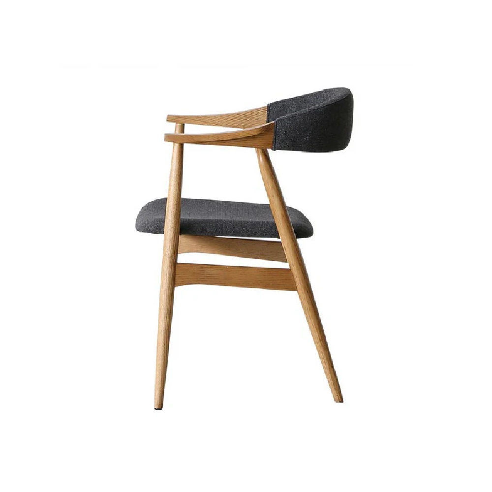 【バックスチェア】背から肘にかけて、なめらかな曲線を描くフレームが特徴のチェア。背当たり・ 肘当たりの良さと、すっきりと洗練されたフォルムを両立させた絶妙なデザイン に仕上がっています。シックで落ち着いた風合いのファブリックが、柔らかい ニュアンスを与えています。