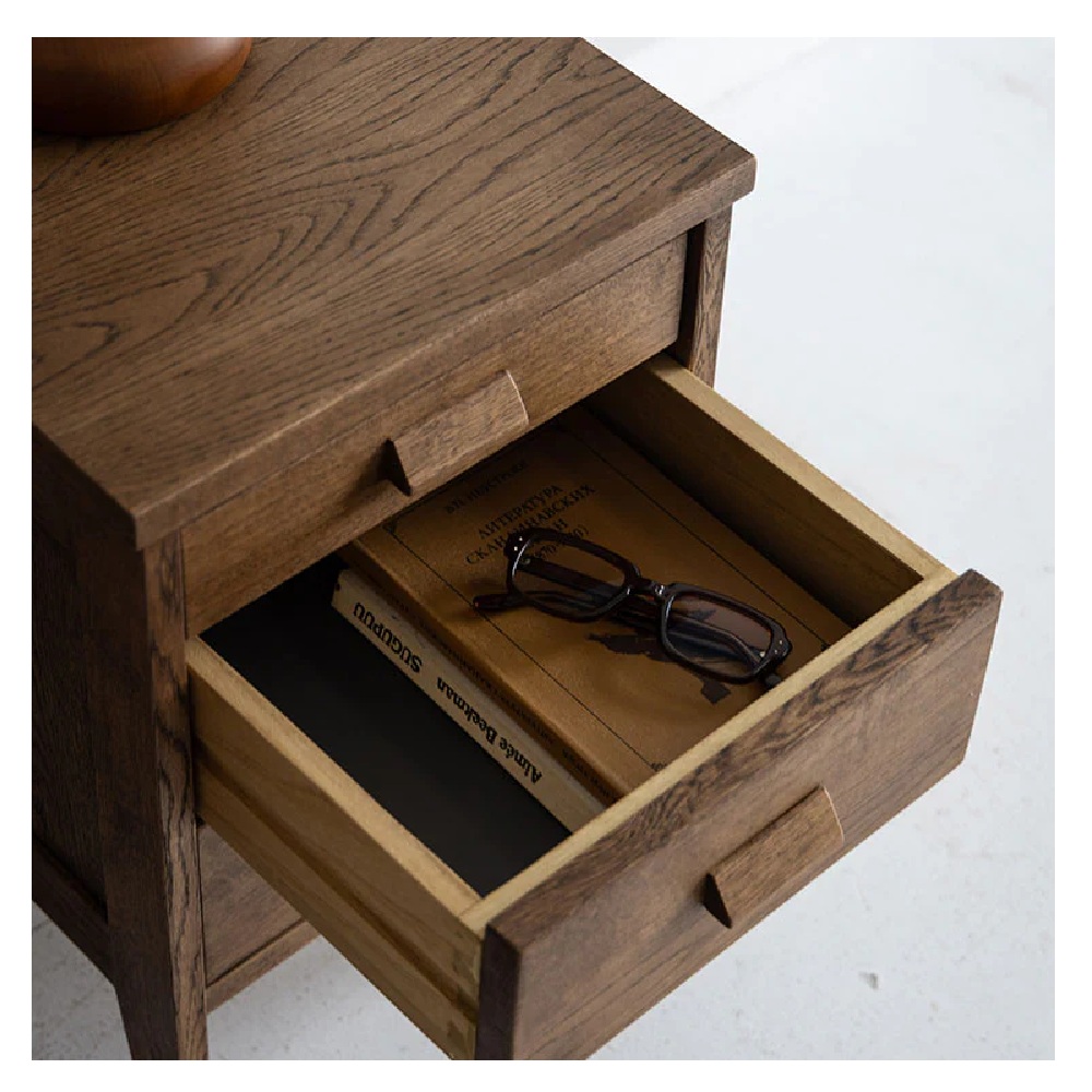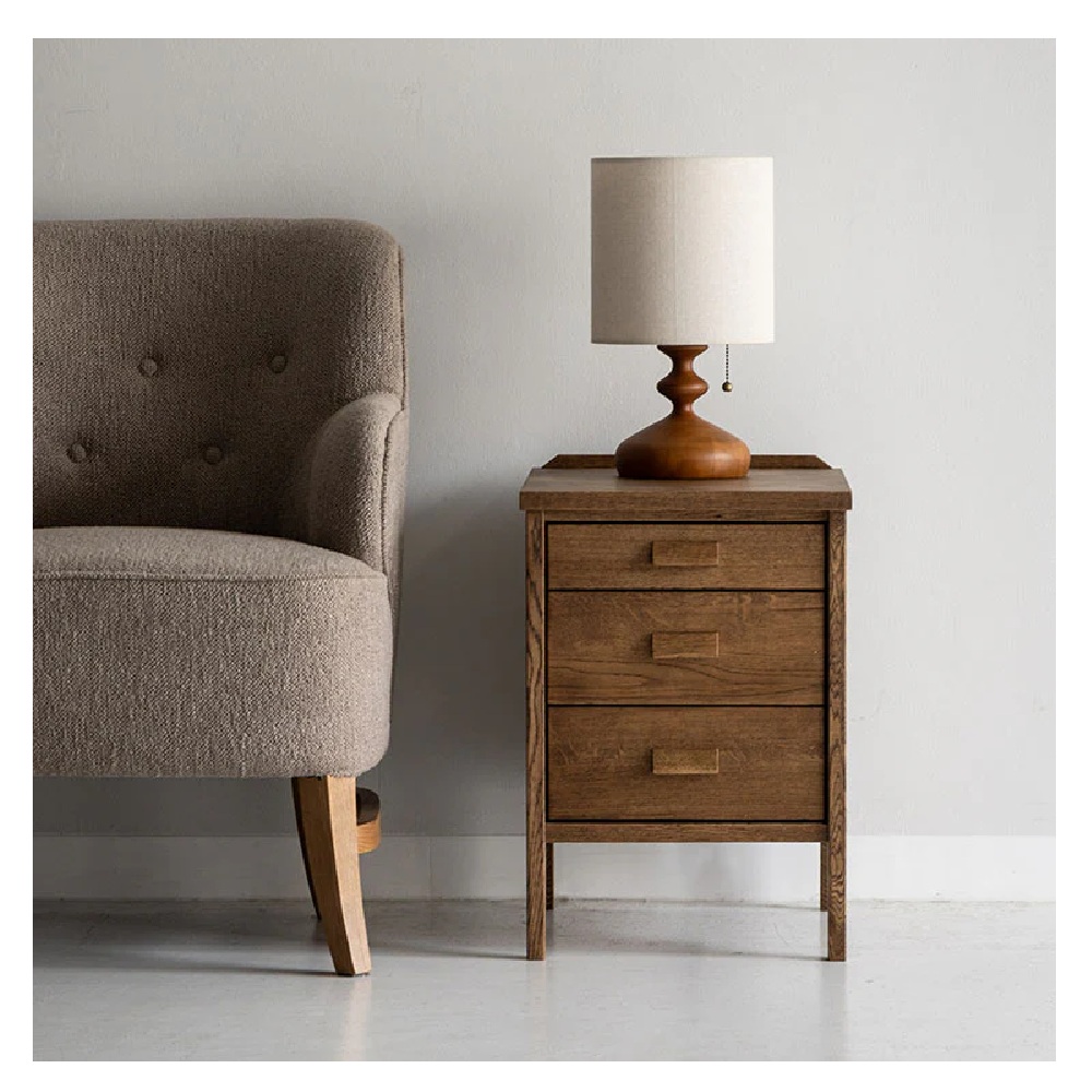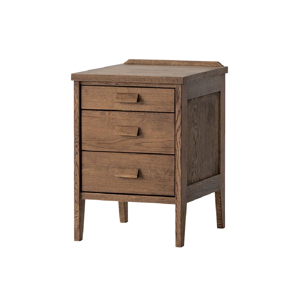 【コテ サイドチェスト】 自然な温かみのある風合いのナラ材を使った、ころんとした可愛らしいチェストです。スペースを圧迫しないミニサイズで、ベッドサイドやソファサイドの細々した収納にぴったり。シンプルなデザインで優しく空間に調和します。天板上に置いた小物が後ろに落ちないよう桟が付いています。