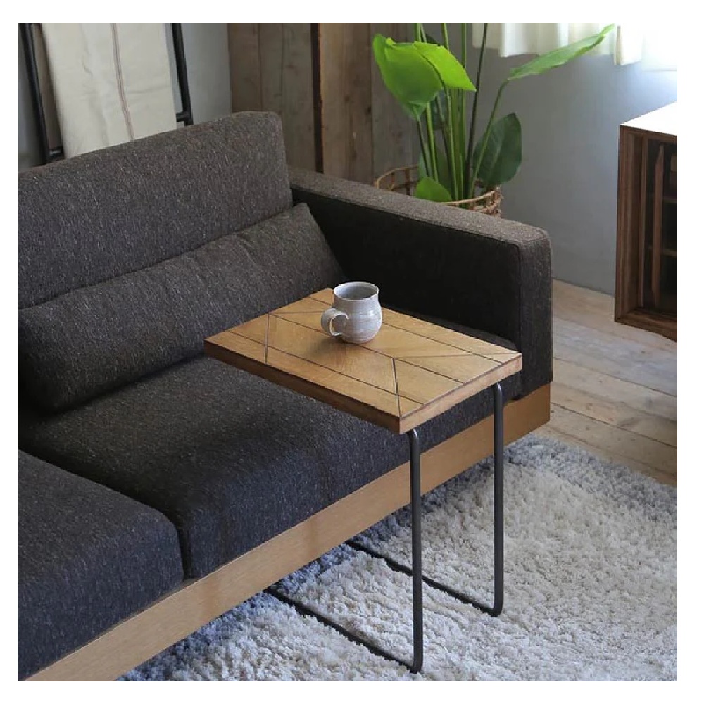 【チャイサイドテーブル】 コの字のスチールフレームに木の天板を組み合わせたシンプルなサイドテーブルです。ソファーの座面に挟んで使うこともできます。木の風合いを生かした矢柄天板・パイン古材の2種類の天板タイプをお選び頂けます。